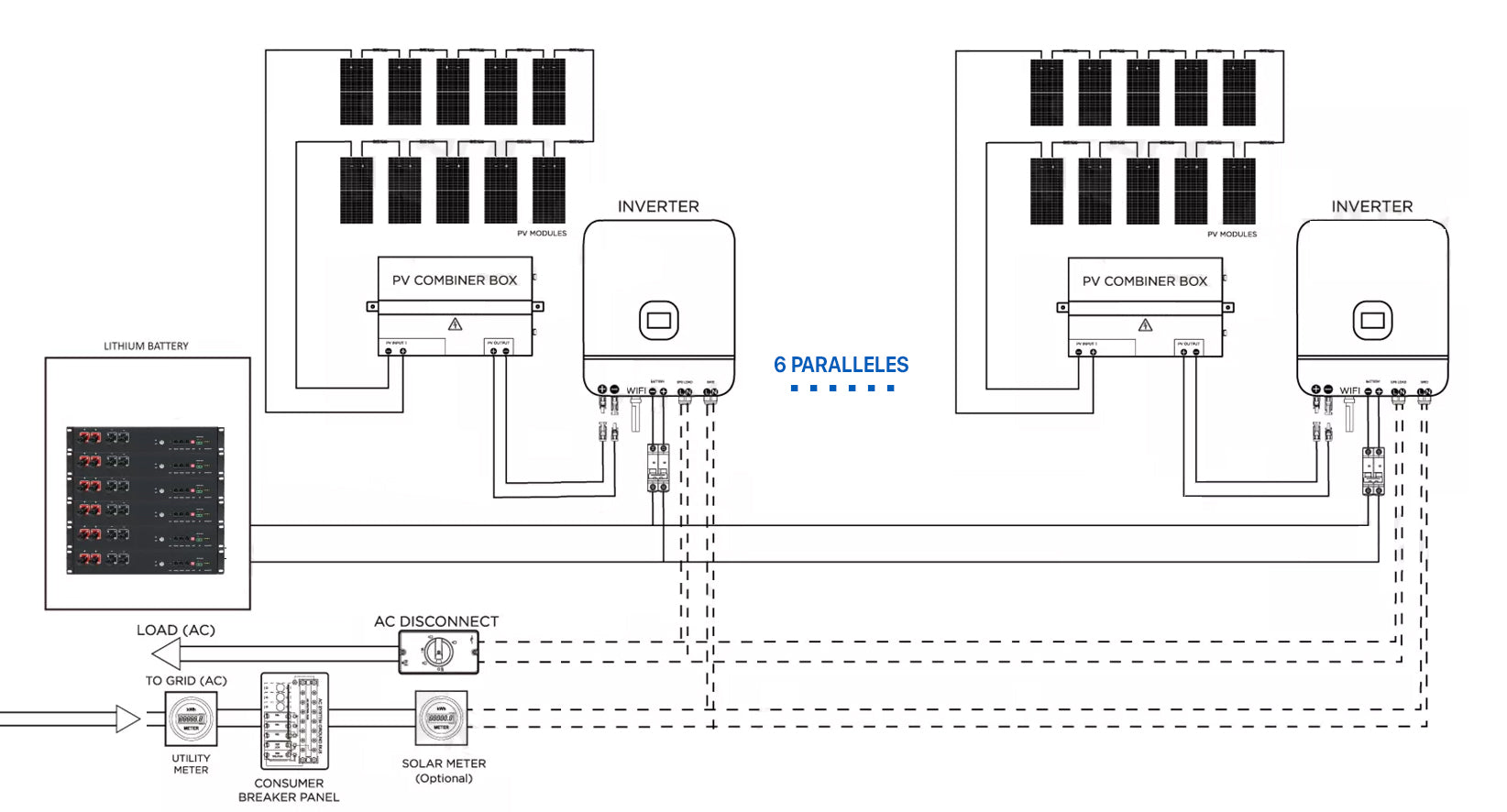 | Work with battery or without battery, Solar input can be directly used for AC output. | Support parallel operation for capacity expansion up to 30kW. |