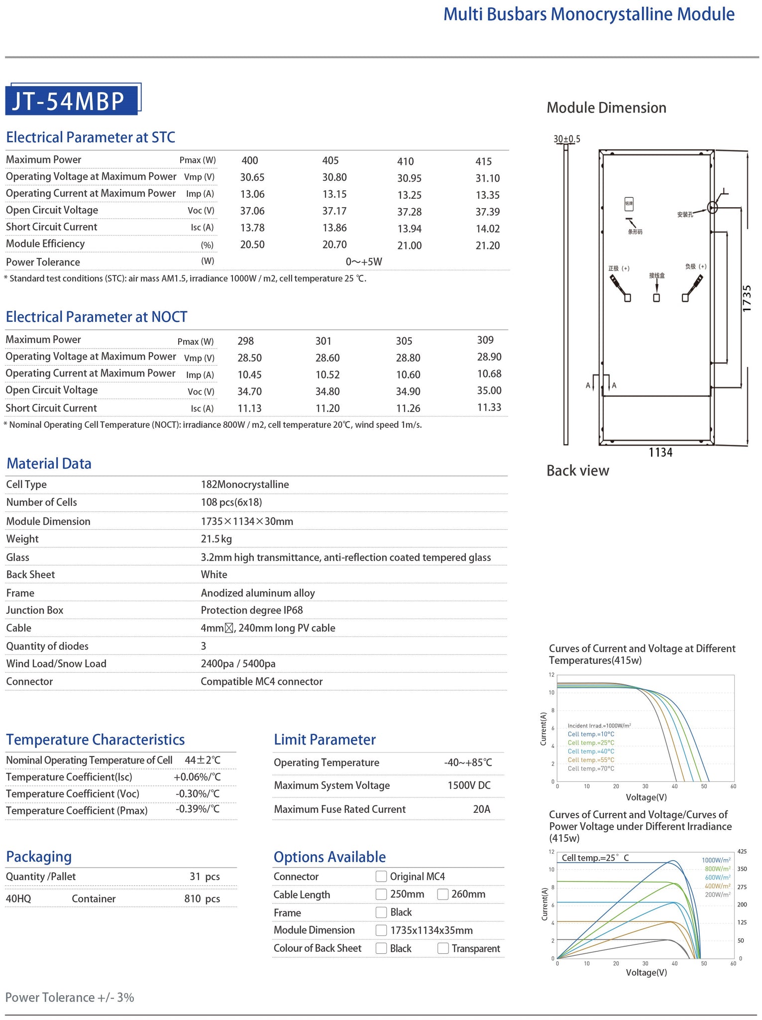 400-415 W High Efficiency Monocrystalline Solar Module 400-415W 0~+3% Positive toleranceIEC61215(2016), IEC61730(2016) ISO9001:2015: Quality Management System ISO14001:2015: Environmental Management System Module Features 1. Half-Cell (HC) Technology Lower EnergyBy using half-cells, the electrical current ( flowing in each busbar is halved.Therefore, theamount...